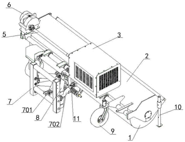 1、滚刷 2、滚刷挡雪外罩 3、发动机外罩 5、传动轴 6、减速机 7、连接架 8、悬挂支架 9、**轮 10、支腿 11、避障弹簧 701、角度调节缸 702、升降油缸
